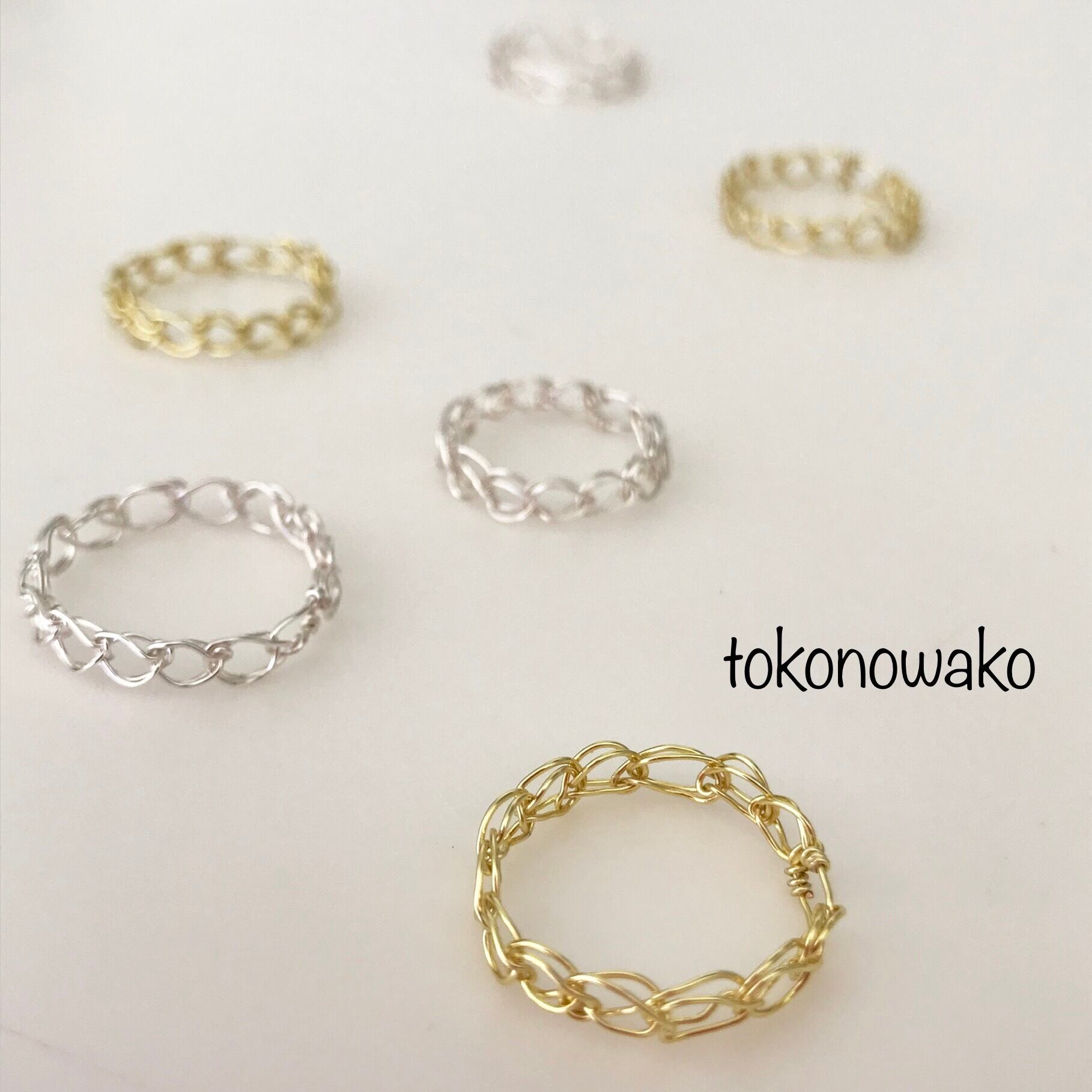 スレッド編みはワイヤーが太いため、目を揃えるのが難しいですが、シンプルなデザインが飽きがこず普段使いして頂けるリングになっています。